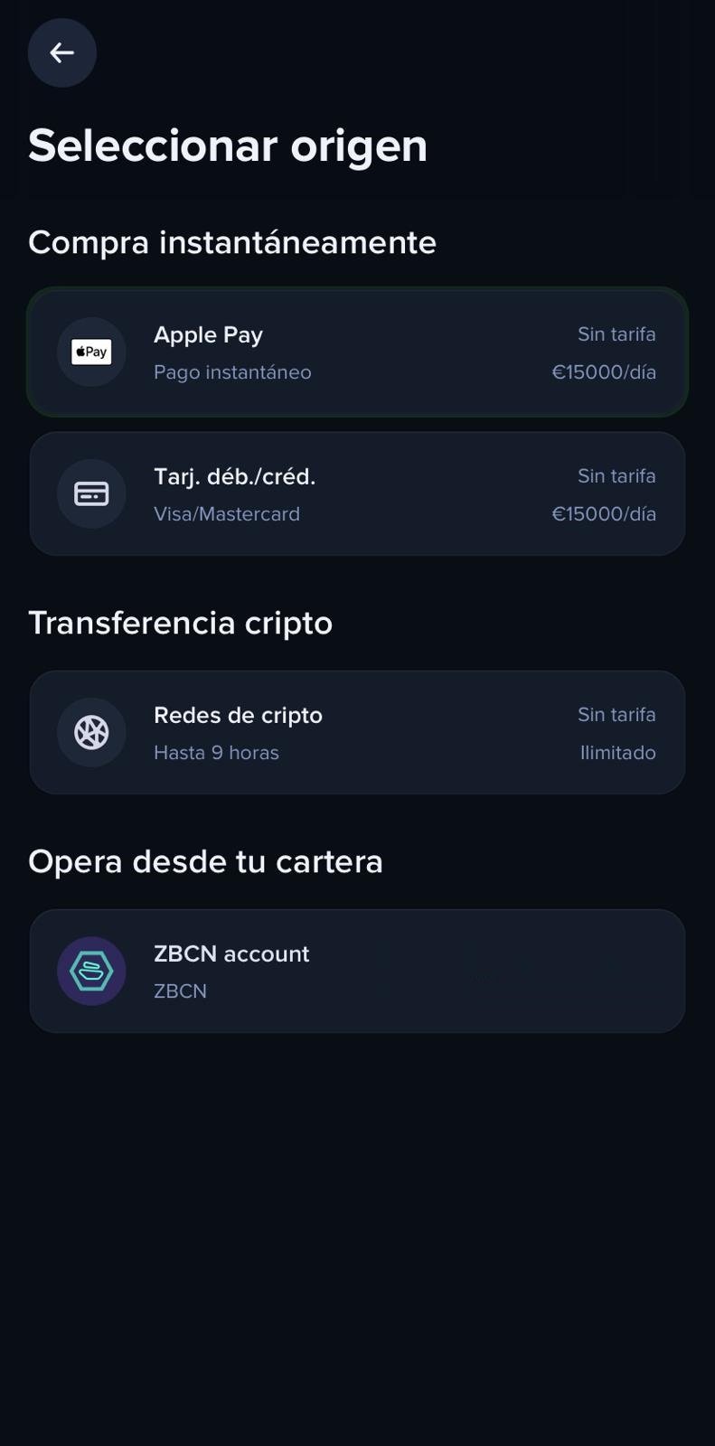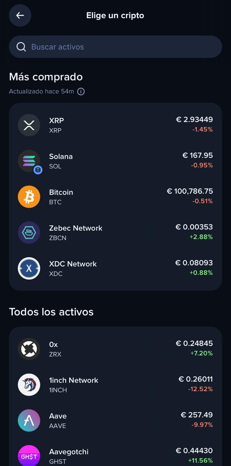 Una vez añadido el método de pago, volveremos a la página principal y haremos clic en «Comprar» y, a continuación, elegiremos la criptomoneda deseada: